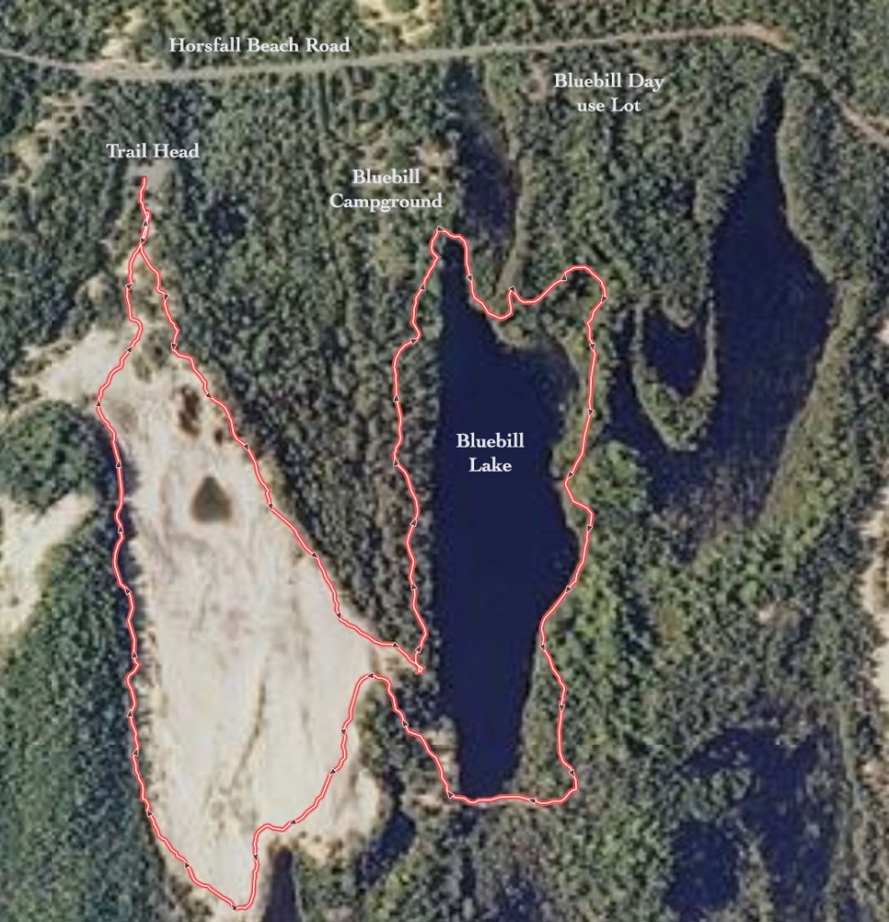 Trail Description: Start the trail from the day use area of the Wild Mare Horse Camp. The trail begins at the southeast corner of the parking lot. Follow the sand trails, generally taking the left option where options exist, until you reach Bluebill Lake. You’ll go left there too, taking you counterclockwise around the lake. After the lake you’ll be heading for the tree line to the west. Follow the trail to the left, and to the south, you’ll see a pond below you as you walk along the dunes to the tree line. Follow the trail to the right along the tree line, and continue until you re-join the trail you started on…taking you back to the parking lot.
